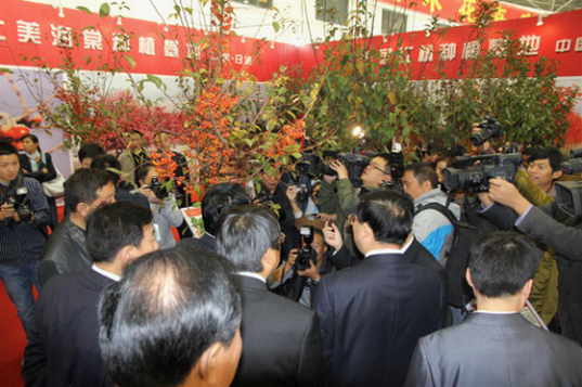 本届苗交会我公司以硕果累累、颜色多样的北美海棠和集合了优雅树形与靓丽颜色为一身的美国红枫吸引了众多参展领导和参展商以及全国各地苗木爱好者来我公司展位参观。来参观的领导有:国家林业局副局长张永利,安徽省委常委、合肥市委书记吴存荣,省政府副省长梁卫国,国家林业局国有林场和林木种苗工作总站总站长杨超,国家林业局驻合肥森林资源监督办事处专员薛全福,安徽省委副秘书长张杰,省政府副秘书长孙正东,省林业厅厅长程中才,副厅长、巡视员汪炳瑜等。参观中销售总监郑柏兵对参观人员简要介绍了红杏在线视频概况、发展历程以及公司引进的主要产品和未来的发展规划。参观结束后各位领导对我公司的苗木品种就美化环境和观赏价值给予了高度赞誉。