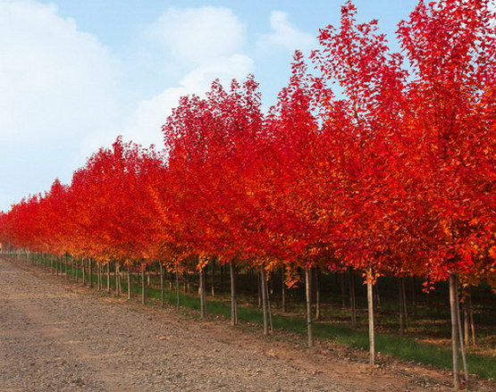 美国红枫叶色鲜红美丽,在园林绿化中被广泛应用,同时也常用作干旱地防护林树种和风景林树种。美国红枫适应性较强,杰出的园林样本树种,树干笔直,木质坚硬,树叶整洁,秋季色彩艳丽。