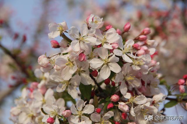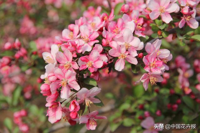 而今天,记者想介绍的是一些不常见的品种。其中,红花系的‘紫色王子’春季叶片呈紫色,气质高贵;‘满满’花如其名,花朵和果实都是挂满枝头;‘粉红公主’开玫瑰粉色花,满满的少女感;‘罗宾逊’开深粉红色花,果实能挂到第二年开春。